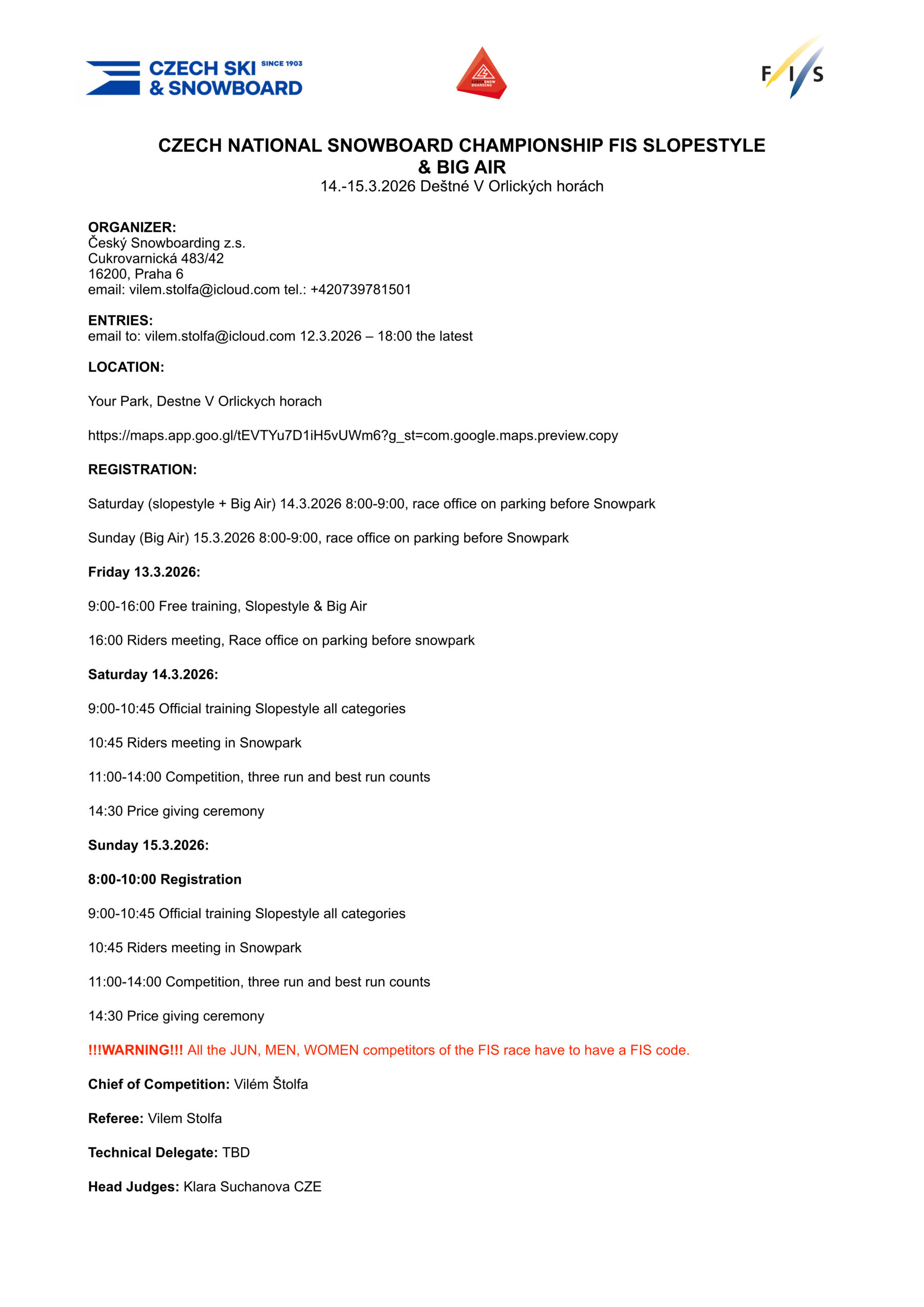 Tato vrcholná událost domácí snowboardové sezóny slibuje napínavou podívanou, kde se představí nejlepší čeští jezdci i talentovaní nováčci. Pro diváky bude připraveno test centrum snowboardů, kde si zdarma můžou vyzkoušet nejnovější modely a získat odborné rady od profesionálů. “Mistrovství ČR je skvělou příležitostí pro mladé jezdce vstoupit do světa závodního snowboardingu, zajezdit si na jednom místě s reprezentanty ČR a jediná soutěž u nás, kde je možné získat body pro start na mezinárodních soutěžích” uvedl organizátor akce Martin Černík “. Program závodů začne v sobotu disciplínou Slopestyle, kde jezdci předvedou své dovednosti na sérii překážek a skoků. Neděle bude patřit disciplíně Big Air, zaměřené na technicky náročné triky na velkém skoku. Trať je postavena tak, aby uspokojila snowboardisty všech úrovní. Podrobný harmonogram bude upřesněn před začátkem akce.